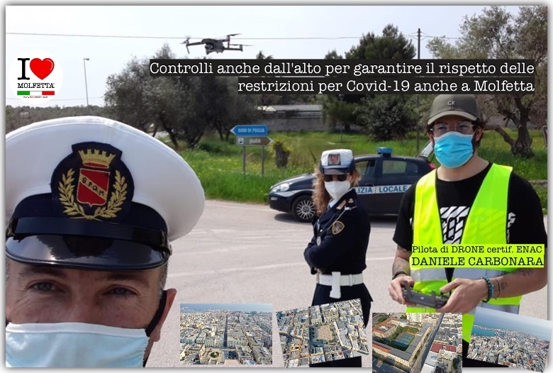 Il drone utilizzato è stato "pilotato" dal giovane molfettese Daniele Carbonara, pilota di drone certificato ENAC, insieme con la Polizia Locale ha controllato dall'alto Molfetta nei giorni di Pasqua e Pasquetta sia nelle ore mattutine che pomeridiane. Il risultato che a Molfetta i cittadini stanno rispettando le regole.